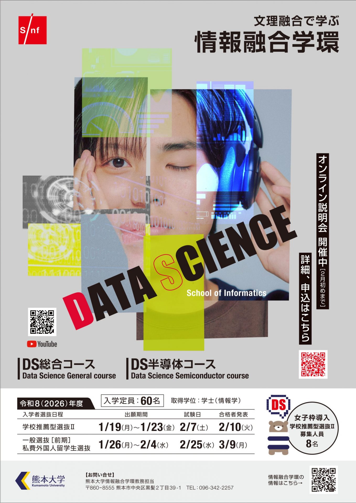 情報融合学環では、令和8年度入試(令和7年度実施)に向けたオンライン説明会を開催いたします。 オンライン説明会の申込は、こちらから。 オープンキャンパスにご参加いただけなかった方や、もっと詳しく知りたい方など、少しでも受…